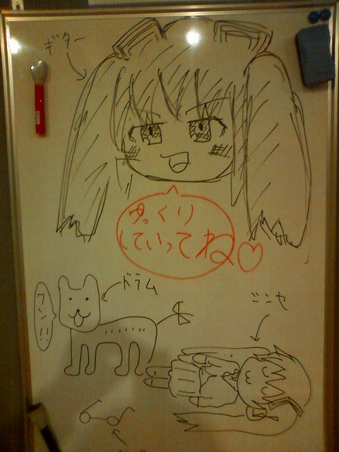 ・今日は大学サボって一日中作業作業作業。 ようやく俺はスタートラインに立てたようだ。 もしかしたら俺は天才なのかもしれない幻想をようやく打ち消せた。 わかってる。俺はただの負け犬なのだ。路傍の石。ゴミ。クズ。カス。 頭でわかっていても、身に染みないとわかんないよなぁこればっかりは。うん。 ここ最近の出会いやらライブやら曲作りや初音ミクちゃんの曲うpを通して 俺はそれをようやく実感できた。ありがたい。 負けるにしたって負け方ってもんがある。はい、もう一度やり直し。 そもそもだ、存在自体が存在意義にはなり得ない。 なにもかもが付加価値。フガジ。fucked up situation …みたいなことを一人ブツブツ喋りながら一日を過ごす。 これだから引き篭もりは笑 ・あまり引き篭もりすぎると妄想が肥大化して人とまともに話せなくなってしまうので 小牧からの山岡の誘いはありがたかった。 柳沢さんの醤油ラーメンを食い、エナジーを養う。 え、なんか養うの「養」がムカデに見える…。きもい! ・長い時間作業して耳も頭も馬鹿になってるからか、 前回のモールのライブ音源がすげえよく聴こえる。 というか、かなりいいんじゃないかこれは? なんだ俺たち最高じゃないか!ふひひ。 MCは最高にきもい ・トリステザが素晴らしく良い。 バンドサウンドだけで音楽が成り立ってる。 ハードコアというよりはポストロックにしたほうが売れるわな。 ・明日は梅毒見に行く。 ・てか何者かの手によって誰も知らないメロディ(だれしら)がようつべにアップされてたんだけどwww しかもこっちのほうが大画面! まぁ誰だか知らないけどありがとうございましたw やはりイラストがいいですよね。 曲が良いとは口が裂けてもまだ言えないのでDTMももっと頑張ろう。 ・学校は相変わらず糞つまらない。時給を出して欲しい。というのは冗談だけど書くこと無し。